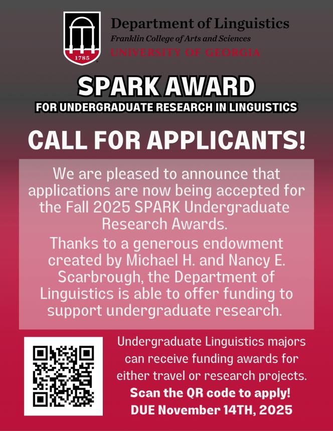 Completed applications can be submitted to Amy Smoler at linguistics@uga.edu or 142 Gilbert Hall.